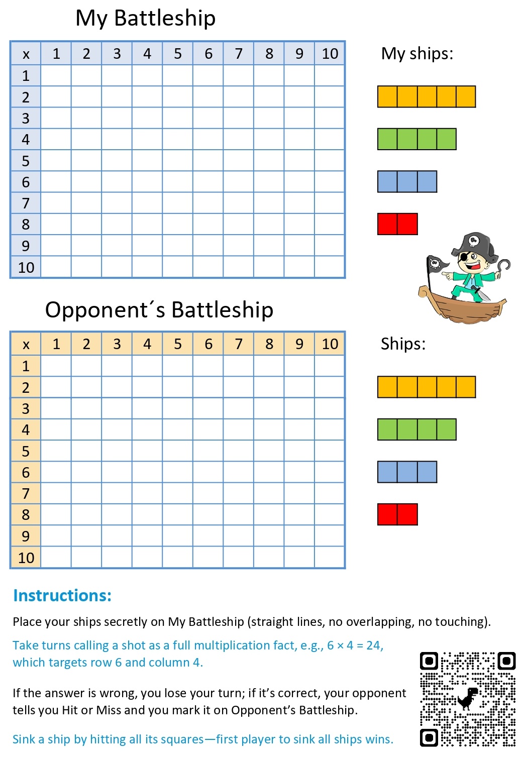 Goal: Be the first player to find and “sink” all of your opponent’s ships by using multiplication facts.